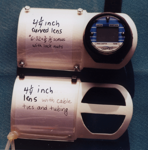 Lay your finished template over the white sewer pipe and trace it with a pencil. Avoid the flared end of pipe for this project. You will need to drill some holes for the saw blade to fit into the computer cutout section. Keep holes inside the penciled pattern. After your slate is cut, you will need to file the edges smooth and straight. Create a bevel under the two outer most inside edges of the computer cutout. This will allow the uwatec strap shoulders to slip under the cutout edge. Rough edges can be smoothed with sandpaper and to remove all factory print and scuffs. Fit your computer or bottom timer straps into your cutout. If you are mounting a uwatec bottom timer, it should fit snugly within the cutout. Slip one wrist strap shoulder under one side of the cutout. Next, use both thumbs to slightly bend and slip the other shoulder under. This should take minimal effort and lock the bottom timer in place. This process goes smoothly if a proper bevel is created under the cutout edge. The bevel provides a plane for the shoulder to glide into place. It is now securely integrated with the slate. This is the only design that provides an active mount to the slate. If you are making a computer mount with two elongated slots, it provides a passive computer mounting system. Many divers use their slate to carry decompression information. In the following narrative I offer options to help retain and read your schedule.